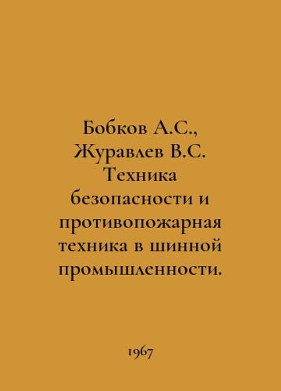 Bobkov A.S., Zhuravlev V.S. Safety and fire-fighting equipment in the tire industry. In Russian /Bobkov A.S., Zhuravlev V.S. Tekhnika bezopasnosti i protivopozharnaya tekhnika v shinnoy promyshlennosti. M. Publishing House Khimiya. 1967 year..You are welcome to reach out to us for a detailed description of the copies currently available. Delivery of this book may take longer than usual including extended processing and pre-shipping time, no expedited shipping is available. Please advise us if you have a set date or a deadline to receive your order. SKUalb01e885c1b9d58d84