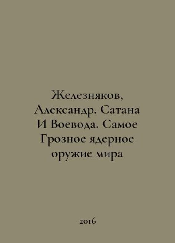 Zheleznyakov, Alexander. Satan & Voevoda. The Most Terrible Nuclear Weapons in the World In Russian /Zheleznyakov, Aleksandr. Satana I Voevoda. Samoe Groznoe yadernoe oruzhie mira The series: War and We Rocket M. Eksmo 2016. You are welcome to reach out to us for a detailed description of the copies currently available. SKUalb0341bfcc1b65ec1a.