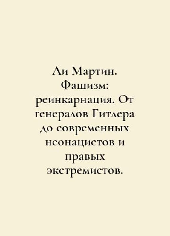 Lee Martin. Fascism: reincarnation. From Hitlers generals to modern neo-Nazis and right-wing extremists. In Russian /Li Martin. Fashizm: reinkarnatsiya. Ot generalov Gitlera do sovremennykh neonatsistov i pravykh ekstremistov. M. Kuchkovo field 2022. 512 You are welcome to reach out to us for a detailed description of the copies currently available. Delivery of this book may take longer than usual including extended processing and pre-shipping time, no expedited shipping is available. Please advise us if you have a set date or a deadline to receive your order.SKUalb0501a4bcbc21680b