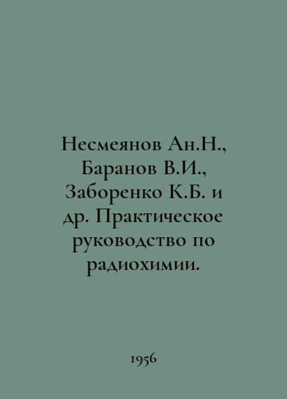 An.N. Nesmeyanov, V.I. Baranov, K.B. Zaborenko et al. Practical Guide to Radiochemistry. In Russian /Nesmeyanov An.N., Baranov V.I., Zaborenko K.B. i dr. Prakticheskoe rukovodstvo po radiokhimii. An.N. Nesmeyanov, V.I. Baranov, K.B. Zaborenko et al. Practical Guide to Radiochemistry..You are welcome to reach out to us for a detailed description of the copies currently available. Delivery of this book may take longer than usual including extended processing and pre-shipping time, no expedited shipping is available. Please advise us if you have a set date or a deadline to receive your order. SKUalb471a822d7d8c7a54