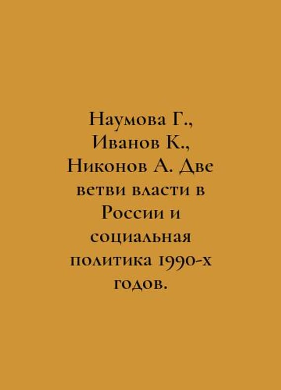 Naumova G., Ivanov K., Nikonov A. The two branches of government in Russia and the social policy of the 1990s. In Russian /Naumova G., Ivanov K., Nikonov A. Dve vetvi vlasti v Rossii i sotsialnaya politika 1990-kh godov. Sevastopol. ECOSI-Hydrophysics. 20127.272pp. You are welcome to reach out to us for a detailed description of the copies currently available. Delivery of this book may take longer than usual including extended processing and pre-shipping time, no expedited shipping is available. Please advise us if you have a set date or a deadline to receive your order.SKUalb05cad5a3c8fa6991