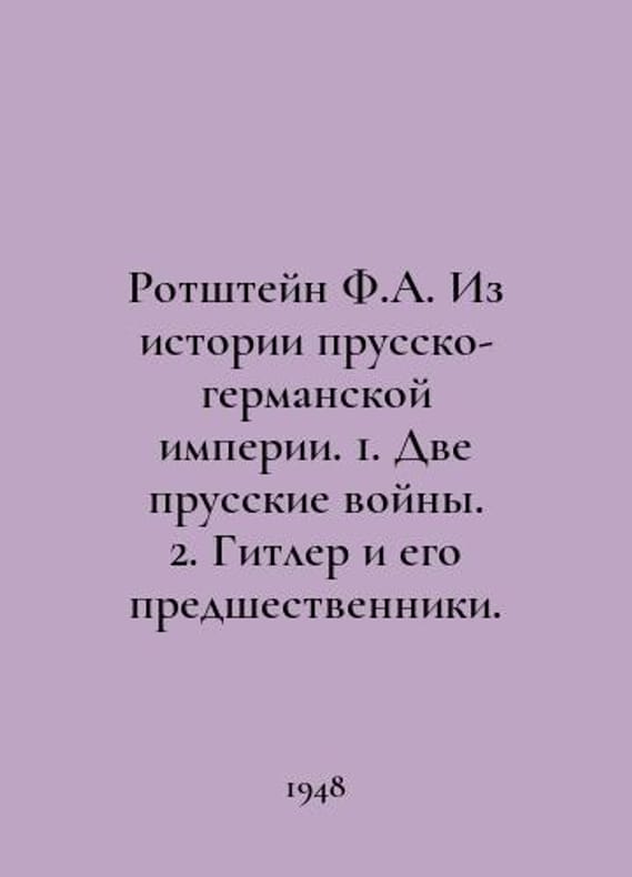 Rothstein F.A. From the history of the Prussian-German Empire. 1. Two Prussian Wars. 2. Hitler and his predecessors. In Russian /Rotshteyn F.A. Iz istorii prussko-germanskoy imperii. 1. Dve prusskie voyny. 2. Gitler i ego predshestvenniki. Popular Science Series -M.-L.: Publishing House of the USSR Academy of Sciences 1948..You are welcome to reach out to us for a detailed description of the copies currently available. Delivery of this book may take longer than usual including extended processing and pre-shipping time, no expedited shipping is available. Please advise us if you have a set date or a deadline to receive your order. SKUalb06ebc583342fe8fa