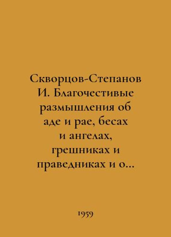 Skvortsov-Stepanov I. Pious reflections on hell and paradise, demons and angels, sinners and righteous, and on the ways to salvation. In Russian /Skvortsov-Stepanov I. Blagochestivye razmyshleniya ob ade i rae, besakh i angelakh, greshnikakh i pravednikakh i o putyakh k spaseniyu. The Popular Library on Atheism. M. Gopolitizdat 1959. You are welcome to reach out to us for a detailed description of the copies currently available. Delivery of this book may take longer than usual including extended processing and pre-shipping time, no expedited shipping is available. Please advise us if you have a set date or a deadline to receive your order.SKUalb07671fe4b0beda9e
