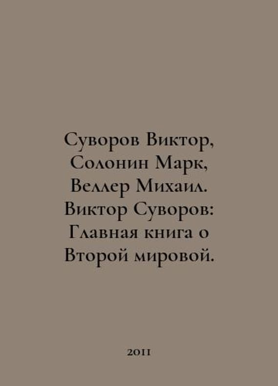 Viktor Suvorov, Mark Solonin, Mikhail Weller. Viktor Suvorov: The Main Book on World War II. In Russian /Suvorov Viktor, Solonin Mark, Veller Mikhail. Viktor Suvorov: Glavnaya kniga o Vtoroy mirovoy. Series: The Truth of Viktor Suvorov. M., Yauza-press, 2011. You are welcome to reach out to us for a detailed description of the copies currently available. SKUalb095ea2380eea65c7.