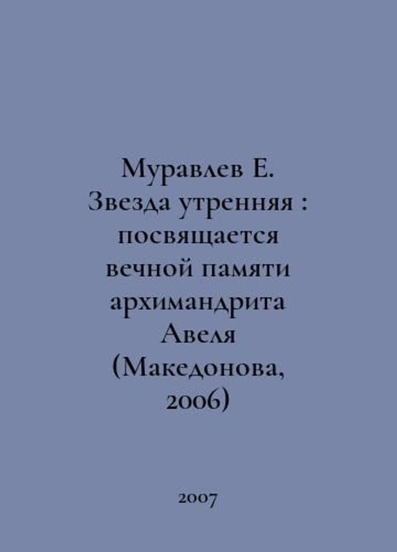 Muravlev E. Morning Star: Dedicated to the Eternal Memory of Archimandrite Abel (Makedonov, 2006) In Russian /Muravlev E. Zvezda utrennyaya : posvyashchaetsya vechnoy pamyati arkhimandrita Avelya (Makedonova, 2006) Autoproject by Evgeny Muravlev and Dmitry Fomichev. Moscow. Locus Standi 2007..You are welcome to reach out to us for a detailed description of the copies currently available. Delivery of this book may take longer than usual including extended processing and pre-shipping time, no expedited shipping is available. Please advise us if you have a set date or a deadline to receive your order. SKUalb0be2fa5f4e53431d