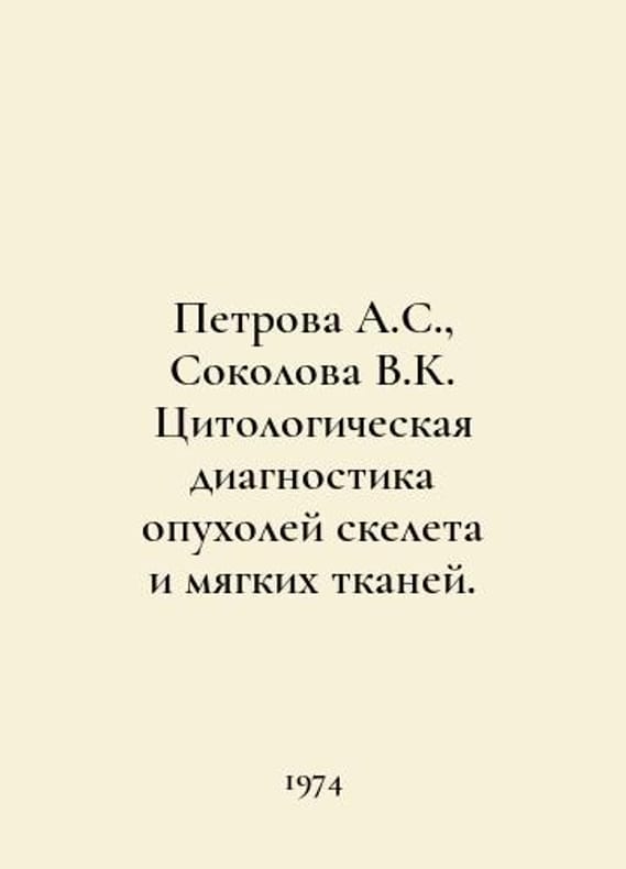 Petrova A.S., Sokolova V.K. Cytological diagnosis of skeletal and soft tissue tumors. In Russian /Petrova A.S., Sokolova V.K. Tsitologicheskaya diagnostika opukholey skeleta i myagkikh tkaney. M. Medicine. 1974..You are welcome to reach out to us for a detailed description of the copies currently available. Delivery of this book may take longer than usual including extended processing and pre-shipping time, no expedited shipping is available. Please advise us if you have a set date or a deadline to receive your order. SKUalb0d24774c3670f8f0