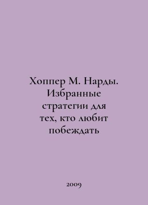 Hopper M. Backgammon. Selected strategies for those who like to win In Russian /Khopper M. Nardy. Izbrannye strategii dlya tekh, kto lyubit pobezhdat M. Centropolygraph 2009..You are welcome to reach out to us for a detailed description of the copies currently available. Delivery of this book may take longer than usual including extended processing and pre-shipping time, no expedited shipping is available. Please advise us if you have a set date or a deadline to receive your order. SKUalb0e3fed5a8d2ba28f
