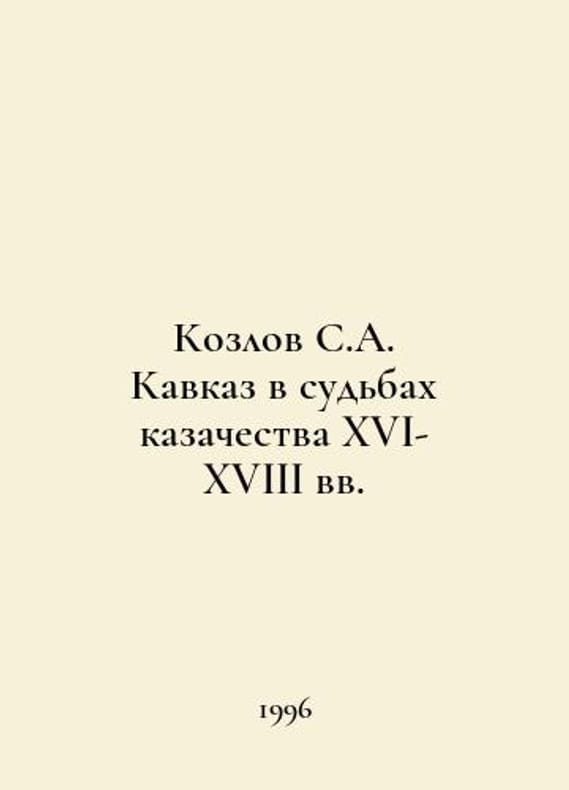 Kozlov S.A. Caucasus in the Fates of the Cossacks in the 16th-18th Centuries In Russian /Kozlov S.A. Kavkaz v sudbakh kazachestva XVI-XVIII vv. St. Petersburg Kolna. 1996. You are welcome to reach out to us for a detailed description of the copies currently available. Delivery of this book may take longer than usual including extended processing and pre-shipping time, no expedited shipping is available. Please advise us if you have a set date or a deadline to receive your order.SKUalb0e77eee93bb27df5