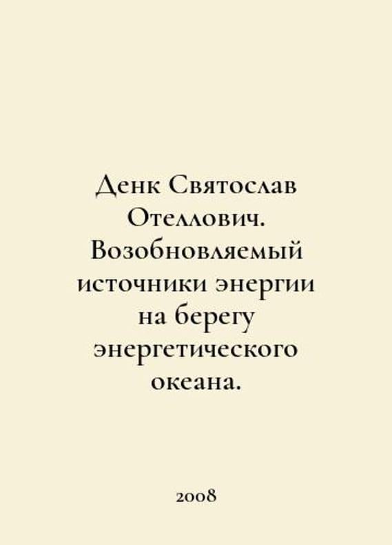 Denk Svyatoslav Otelowicz. Renewable energy sources on the shore of the energy ocean. In Russian /Denk Svyatoslav Otellovich. Vozobnovlyaemyy istochniki energii na beregu energeticheskogo okeana. Perm. Publishing House of Perm State Technical University. 2008.You are welcome to reach out to us for a detailed description of the copies currently available. SKUalb0eacdb32d5c11d0d.