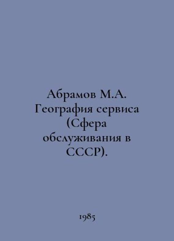 Abramov M.A. Geography of service (Service sector in the USSR). In Russian /Abramov M.A. Geografiya servisa (Sfera obsluzhivaniya v SSSR). M. Thought 1985.You are welcome to reach out to us for a detailed description of the copies currently available. SKUalb11973df18dce95e5.