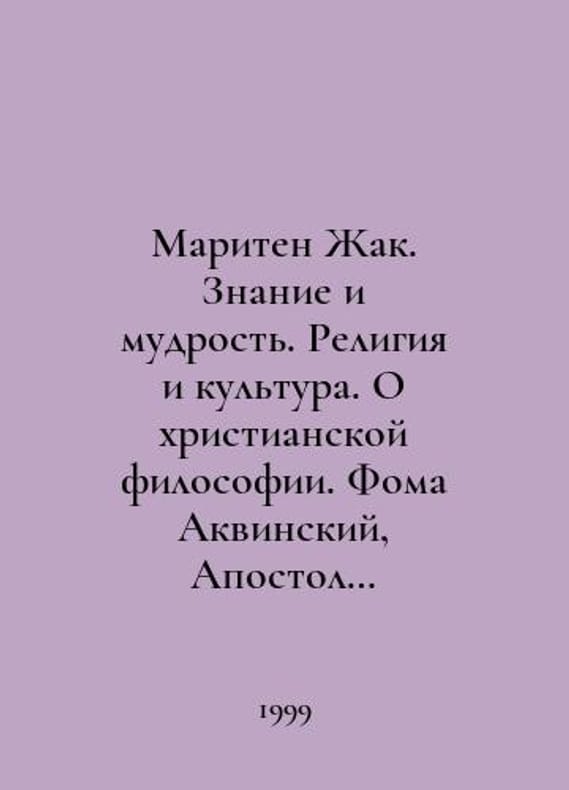 Marine Jacques. Knowledge and Wisdom. Religion and Culture. On Christian Philosophy. Thomas Aquinas, Apostle of Modernity. In Russian /Mariten Zhak. Znanie i mudrost. Religiya i kultura. O khristianskoy filosofii. Foma Akvinskiy, Apostol sovremennosti. M. Naukhnyi mir. 1999..You are welcome to reach out to us for a detailed description of the copies currently available. Delivery of this book may take longer than usual including extended processing and pre-shipping time, no expedited shipping is available. Please advise us if you have a set date or a deadline to receive your order. SKUalb11c5a700a6537d94