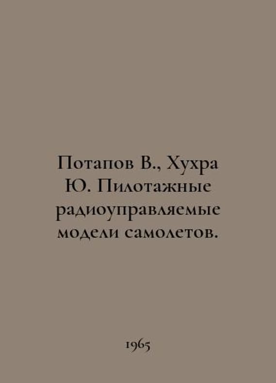 Potapov V., Huhra Yu. Piloted radio-controlled models of airplanes. In Russian /Potapov V., Khukhra Yu. Pilotazhnye radioupravlyaemye modeli samoletov. M. Ezd. DOSAAF. 1965..You are welcome to reach out to us for a detailed description of the copies currently available. Delivery of this book may take longer than usual including extended processing and pre-shipping time, no expedited shipping is available. Please advise us if you have a set date or a deadline to receive your order. SKUalb11dc70ab29e81bf4