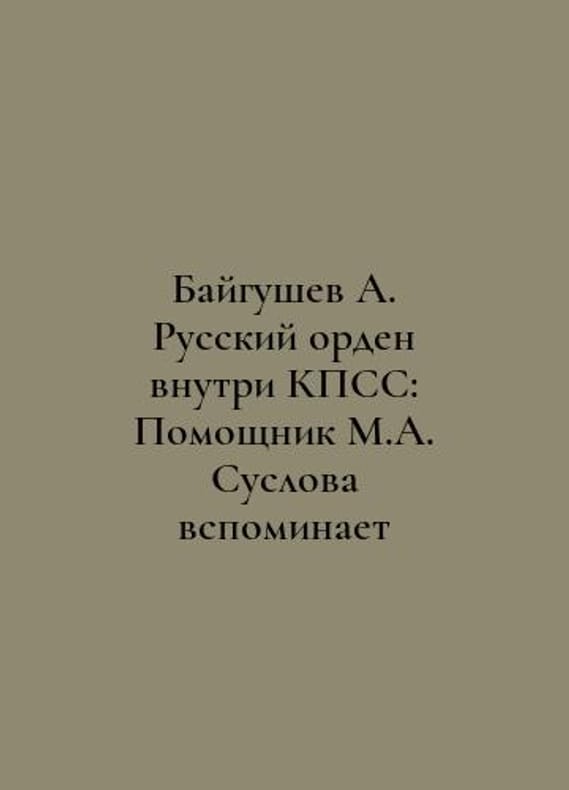 Baygushev A. Russian Order within the CPSU: Assistant to M.A. Suslov recalls In Russian /Baygushev A. Russkiy orden vnutri KPSS: Pomoshchnik M.A. Suslova vspominaet Moscow Motherland 2021. 256 You are welcome to reach out to us for a detailed description of the copies currently available. Delivery of this book may take longer than usual including extended processing and pre-shipping time, no expedited shipping is available. Please advise us if you have a set date or a deadline to receive your order.SKUalb11fff21ab8a5544e