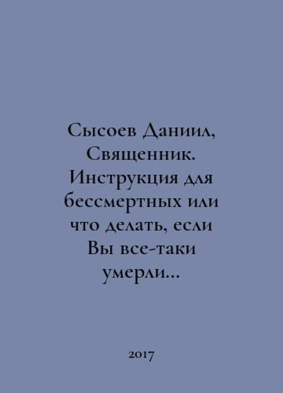 Sysoyev Daniel, Priest. Instructions for the immortals or what to do if you do die? In Russian /Sysoev Daniil, Svyashchennik. Instruktsiya dlya bessmertnykh ili chto delat, esli Vy vse-taki umerli M Priest Daniel Missionary Center 2017. You are welcome to reach out to us for a detailed description of the copies currently available. Delivery of this book may take longer than usual including extended processing and pre-shipping time, no expedited shipping is available. Please advise us if you have a set date or a deadline to receive your order.SKUalb14c36cb0c2db54e4