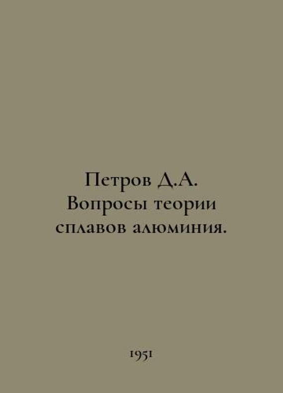 Petrov D.A. Questions of aluminium alloy theory. In Russian /Petrov D.A. Voprosy teorii splavov alyuminiya. Petrov D.A. Questions of the theory of aluminum alloys. 1951.You are welcome to reach out to us for a detailed description of the copies currently available. Delivery of this book may take longer than usual including extended processing and pre-shipping time, no expedited shipping is available. Please advise us if you have a set date or a deadline to receive your order. SKUalb1727fef207eac4e8