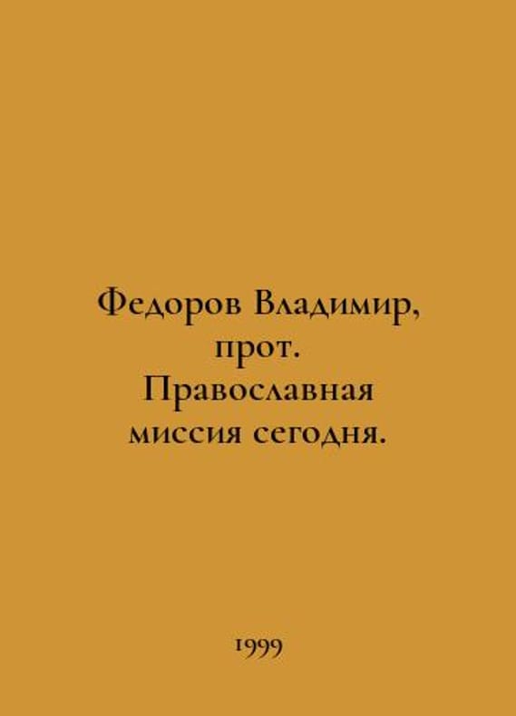 Fedorov Vladimir, Archpriest Orthodox Mission Today. In Russian /Fedorov Vladimir, prot. Pravoslavnaya missiya segodnya. A collection of texts on the course Missiology for Orthodox Theological Schools and Theological Institutions. St. Petersburg Apostolic City. 1999. You are welcome to reach out to us for a detailed description of the copies currently available. Delivery of this book may take longer than usual including extended processing and pre-shipping time, no expedited shipping is available. Please advise us if you have a set date or a deadline to receive your order.SKUalb173d10915bc1ce5f