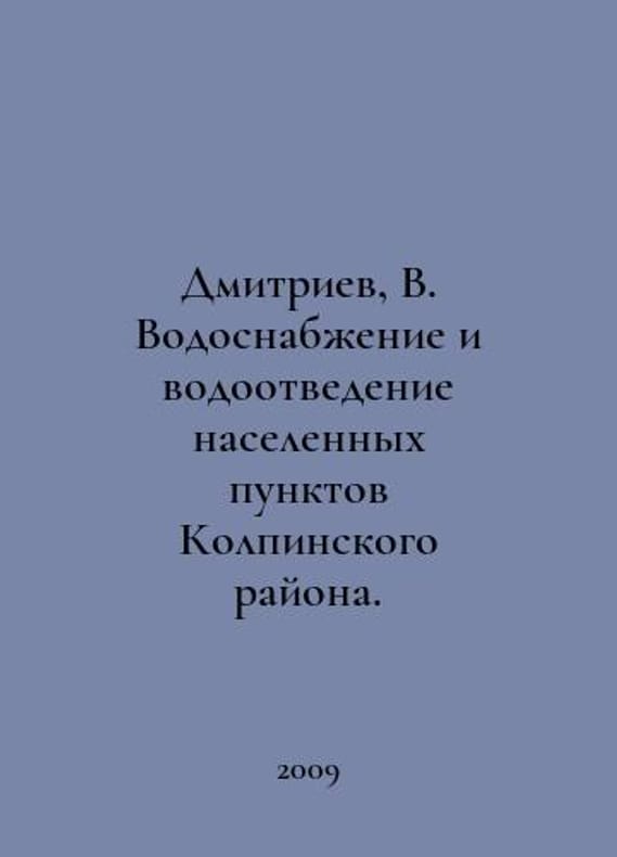 Dmitriev, V. Water supply and sanitation of settlements in Kolpinsky District. In Russian /Dmitriev, V. Vodosnabzheniei vodootvedenie naselennykh punktov Kolpinskogo rayona. SPB New Journal 2009. You are welcome to reach out to us for a detailed description of the copies currently available. Delivery of this book may take longer than usual including extended processing and pre-shipping time, no expedited shipping is available. Please advise us if you have a set date or a deadline to receive your order.SKUalb1a208281e6b07844