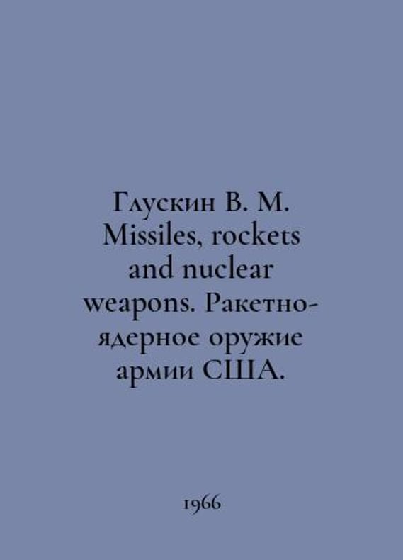 Gluskin V. M. Missiles, missiles and nuclear weapons. Nuclear and missile weapons of the US Army. In English /Gluskin V. M. Missiles, rockets and nuclear weapons. Raketno-yadernoe oruzhie armii SShA. In English. M. Voenizdat 1966. You are welcome to reach out to us for a detailed description of the copies currently available. Delivery of this book may take longer than usual including extended processing and pre-shipping time, no expedited shipping is available. Please advise us if you have a set date or a deadline to receive your order.SKUalb1beead61b7078f0a