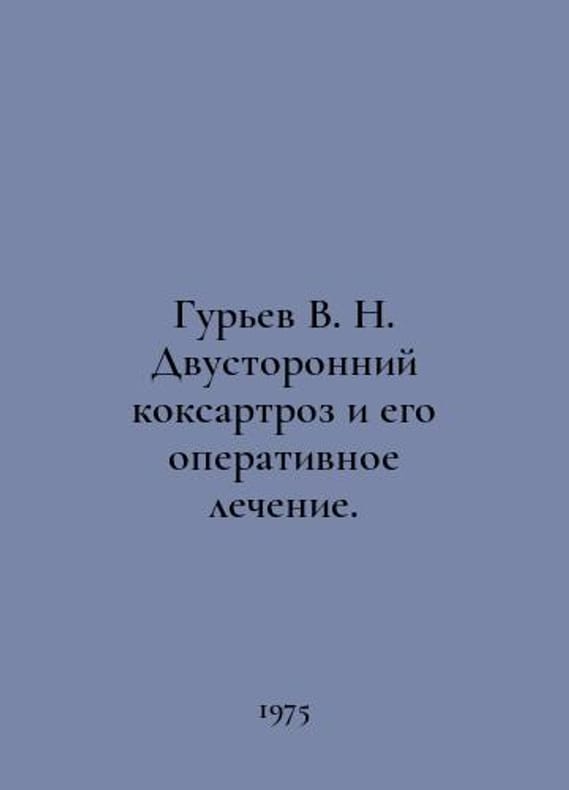 Guriev V. N. Bilateral coxarthrosis and its operative treatment. In Russian /Gurev V. N. Dvustoronniy koksartroz i ego operativnoe lechenie. Tallinn: Valgus. 1975..You are welcome to reach out to us for a detailed description of the copies currently available. Delivery of this book may take longer than usual including extended processing and pre-shipping time, no expedited shipping is available. Please advise us if you have a set date or a deadline to receive your order. SKUalb1d6bfbd0bea62b94