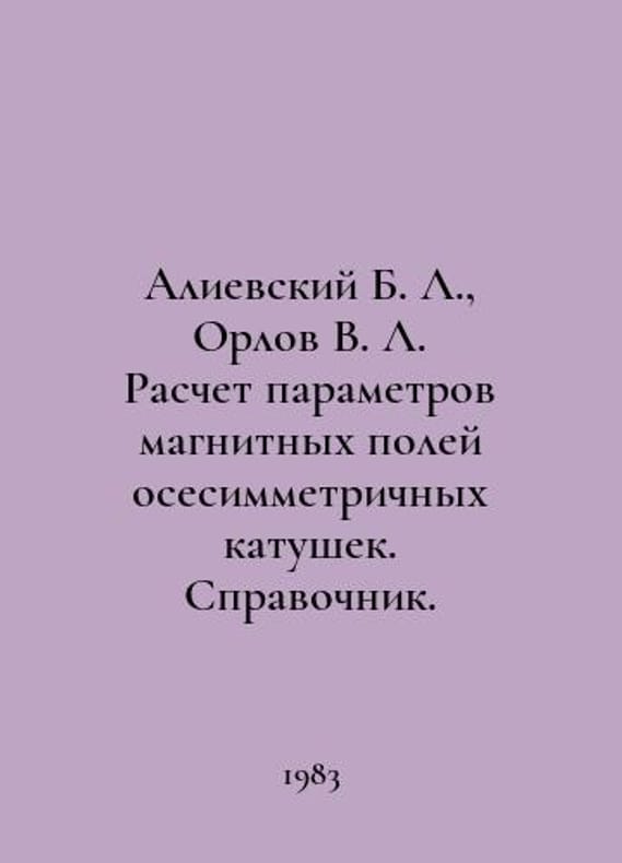 Alievsky B. L., Orlov V. L. Calculation of the magnetic fields of axial coils. Reference book. In Russian /Alievskiy B. L., Orlov V. L. Raschet parametrov magnitnykh poley osesimmetrichnykh katushek. Spravochnik. M. Energoatomizdat. 1983.You are welcome to reach out to us for a detailed description of the copies currently available. SKUalb1e27045b6e4b0173.