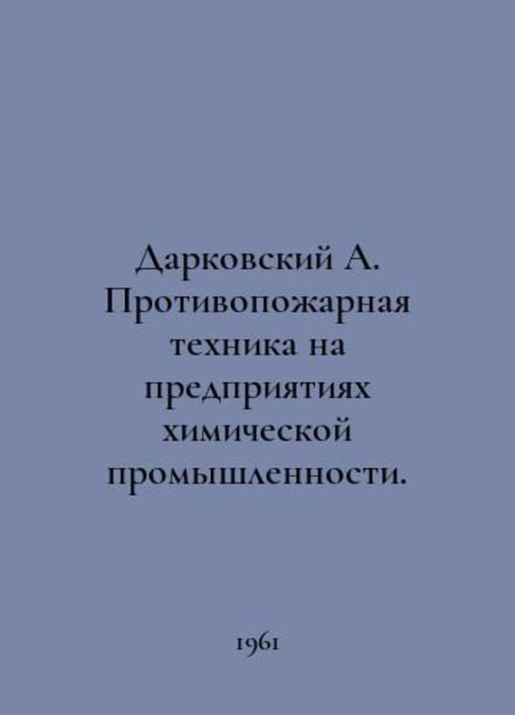 Darkovsky A. Fire-fighting equipment at chemical industry enterprises. In Russian /Darkovskiy A. Protivopozharnaya tekhnika na predpriyatiyakh khimicheskoy promyshlennosti. M. Goskhiizdat, 1961..You are welcome to reach out to us for a detailed description of the copies currently available. Delivery of this book may take longer than usual including extended processing and pre-shipping time, no expedited shipping is available. Please advise us if you have a set date or a deadline to receive your order. SKUalb1e68d0cb293fdbc8