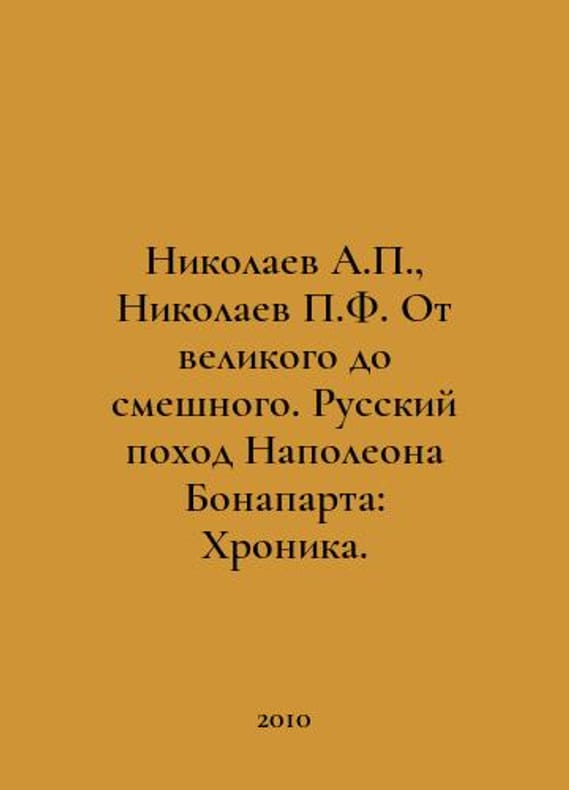Nikolaev A., Nikolaev F. From great to ridiculous. Napoleon Bonapartes Russian March: Chronicle. In Russian /Nikolaev A., Nikolaev F. Ot velikogo do smeshnogo. Russkiy pokhod Napoleona Bonaparta: Khronika. M. Exlibris-Press 2010. You are welcome to reach out to us for a detailed description of the copies currently available. Delivery of this book may take longer than usual including extended processing and pre-shipping time, no expedited shipping is available. Please advise us if you have a set date or a deadline to receive your order.SKUalb21170ceedd8771f3