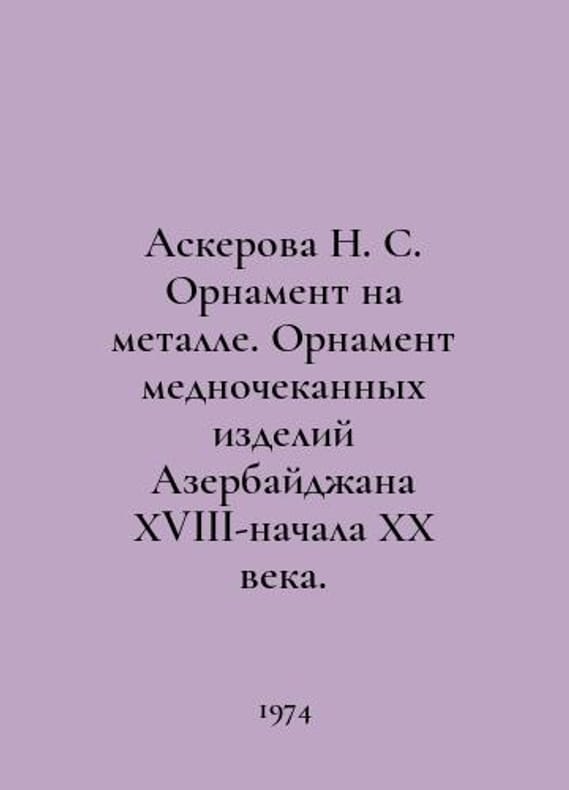 Askerova N. S. Ornament on metal. Ornament of copper-minted products of Azerbaijan of the 18th-early 20th century. In Russian /Askerova N. S. Ornament na metalle. Ornament mednochekannykh izdeliy Azerbaydzhana KhVIII-nachala KhKh veka. Text in Azerbaijani and Russian. Baku. 1974.You are welcome to reach out to us for a detailed description of the copies currently available. SKUalb2398f927decc4da6.