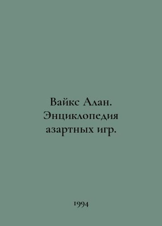 Wicks Alan. An encyclopedia of gambling. In Russian /Vayks Alan. Entsiklopediya azartnykh igr. M Efrat 1994..You are welcome to reach out to us for a detailed description of the copies currently available. Delivery of this book may take longer than usual including extended processing and pre-shipping time, no expedited shipping is available. Please advise us if you have a set date or a deadline to receive your order. SKUalb23eb55a99e22edb5