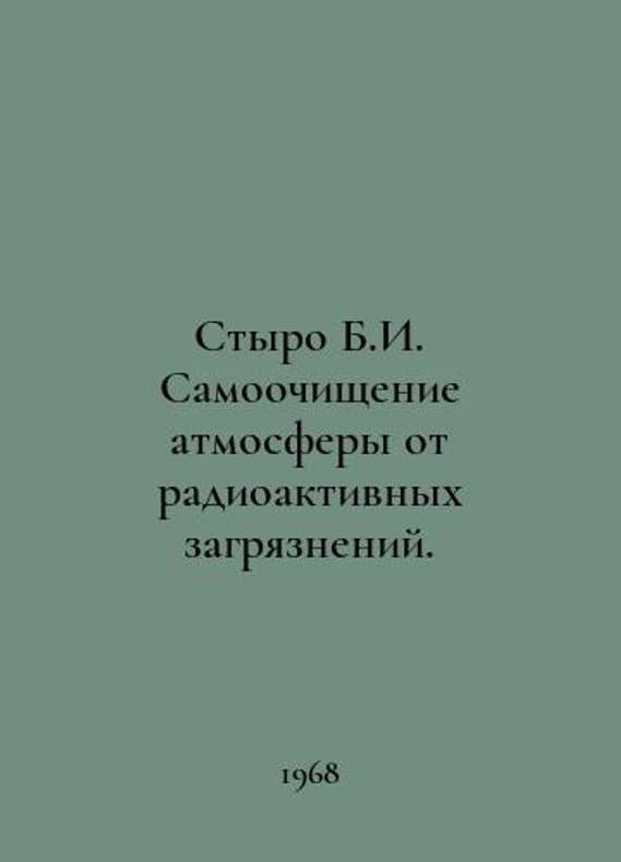 Stir B.I. Self-cleaning of the atmosphere from radioactive contamination. In Russian /Styro B.I. Samoochishchenie atmosfery ot radioaktivnykh zagryazneniy. Circulation of 1,500 copies of Leningrad Hydrometeorological Issuance 1968..You are welcome to reach out to us for a detailed description of the copies currently available. Delivery of this book may take longer than usual including extended processing and pre-shipping time, no expedited shipping is available. Please advise us if you have a set date or a deadline to receive your order. SKUalb24572fd02ac2c040