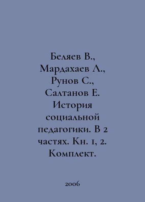 Belyaev V., Mardakhaev L., Runov S., Saltanov E. History of social pedagogy. In 2 parts. Book 1, 2 In Russian /Belyaev V., Mardakhaev L., Runov S., Saltanov E. Istoriya sotsialnoy pedagogiki. V 2 chastyakh. Kn. 1, 2. Komplekt. M.: RGSU, 2006. You are welcome to reach out to us for a detailed description of the copies currently available. SKUalb263669b8bac37da4.