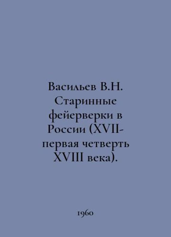 Vasiliev V.N. Ancient fireworks displays in Russia (17th-first quarter of 18th century). In Russian /Vasilev V.N. Starinnye feyerverki v Rossii (XVII-pervaya chetvert XVIII veka). Leningrad State Hermitage Publishing House 1960.You are welcome to reach out to us for a detailed description of the copies currently available. SKUalb28dfa62442d26861.