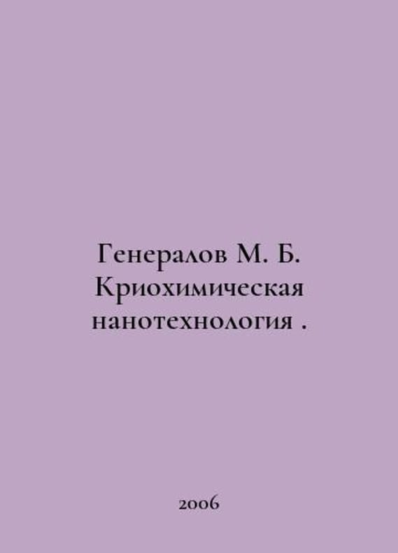 Generalov M. B. Cryochemical Nanotechnology. In Russian /Generalov M. B. Kriokhimicheskaya nanotekhnologiya . Textbook for higher education institutions. M. Akadembook. 2006..You are welcome to reach out to us for a detailed description of the copies currently available. Delivery of this book may take longer than usual including extended processing and pre-shipping time, no expedited shipping is available. Please advise us if you have a set date or a deadline to receive your order. SKUalb2aa4c9bc49693c13