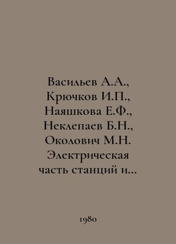 Vasiliev A.A., Kryuchkov I., Nayashkova E.F., Neklepaev B.N., Okolovich M.N. Electric part of stations and substations. Textbook for universities. In Russian /Vasilev A.A., Kryuchkov I., Nayashkova E.F., Neklepaev B.N., Okolovich M.N. Elektricheskaya chast stantsiy i podstantsiy. Uchebnik dlya vuzov. Moscow. Energy. 1980.You are welcome to reach out to us for a detailed description of the copies currently available. SKUalb2ae0214cb5e4042a.