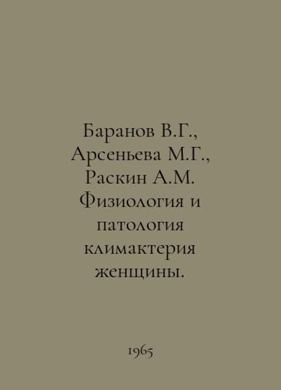 V.G. Baranov, M.G. Arsenyeva, A.M. Raskin Physiology and Pathology of Womens Menopause. In Russian /Baranov V.G., Arseneva M.G., Raskin A.M. Fiziologiya i patologiya klimakteriya zhenshchiny. Under the editorship of Prof. V.G. Baranov. Leningrad Medicine 1965. 272 p. You are welcome to reach out to us for a detailed description of the copies currently available. Delivery of this book may take longer than usual including extended processing and pre-shipping time, no expedited shipping is available. Please advise us if you have a set date or a deadline to receive your order.SKUalb2d498ee803c47464