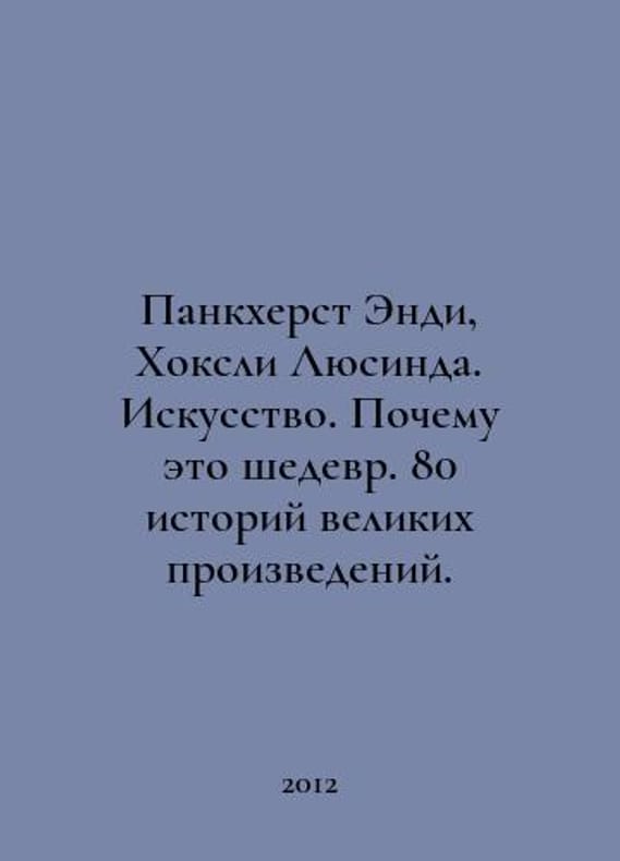 Pankhurst Andy, Hawksley Lucinda. Art. Why its a masterpiece. 80 stories of great works. In Russian /Pankkherst Endi, Khoksli Lyusinda. Iskusstvo. Pochemu eto shedevr. 80 istoriy velikikh proizvedeniy. English translation of Migunova E.Ya.M Sinbad 2012. You are welcome to reach out to us for a detailed description of the copies currently available. Delivery of this book may take longer than usual including extended processing and pre-shipping time, no expedited shipping is available. Please advise us if you have a set date or a deadline to receive your order.SKUalb2d95230eac87625b