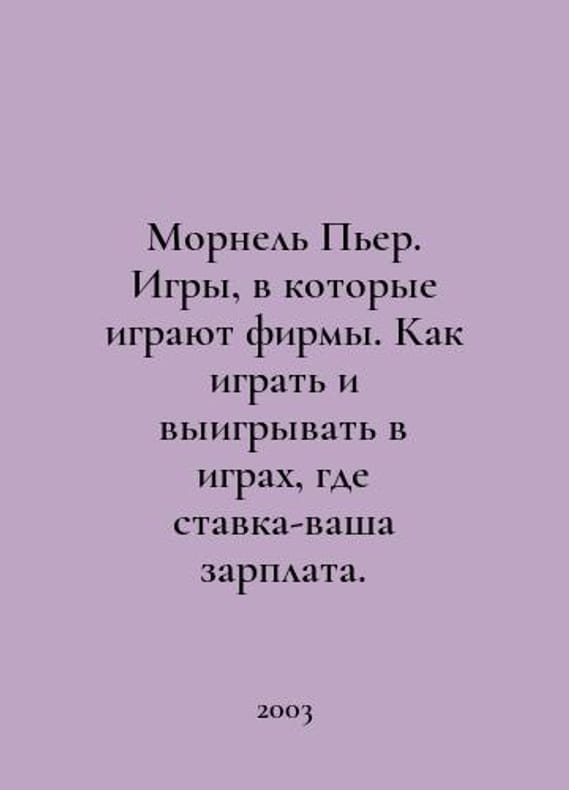 Mornel Pierre. Games played by firms. How to play and win games where the bet is your salary. In Russian /Mornel Per. Igry, v kotorye igrayut firmy. Kak igrat i vyigryvat v igrakh, gde stavka-vasha zarplata. M Good Book 2003.You are welcome to reach out to us for a detailed description of the copies currently available. SKUalb2dcfde8040dee675.