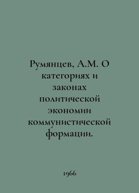 Rumyantsev, A.M. On the categories and laws of the political economy of the communist formation. In Russian /Rumyantsev, A.M. O kategoriyakh i zakonakh politicheskoy ekonomii kommunisticheskoy formatsii. M. Editions Thought 1966.You are welcome to reach out to us for a detailed description of the copies currently available. SKUalb2e1fe2b56d436b88.