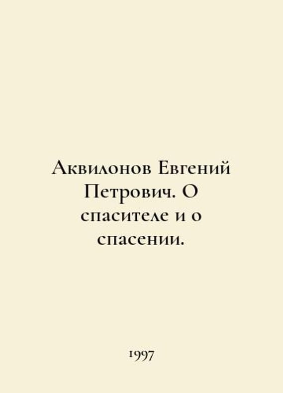 Evgeny Petrovich Aquilonov. About the Savior and the Salvation. In Russian /Akvilonov Evgeniy Petrovich. O spasitele i o spasenii. Moscow Publishing House Journal Moscow. 1997..You are welcome to reach out to us for a detailed description of the copies currently available. Delivery of this book may take longer than usual including extended processing and pre-shipping time, no expedited shipping is available. Please advise us if you have a set date or a deadline to receive your order. SKUalb2e91850d96bd6d4f