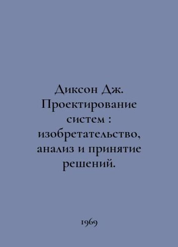 Dixon J. Systems Design: Invention, Analysis, and Decision Making. In Russian /Dikson Dzh. Proektirovanie sistem: izobretatelstvo, analiz i prinyatie resheniy. Translation from English. M. Mir 1969.You are welcome to reach out to us for a detailed description of the copies currently available. SKUalb326f811fe9be2e67.