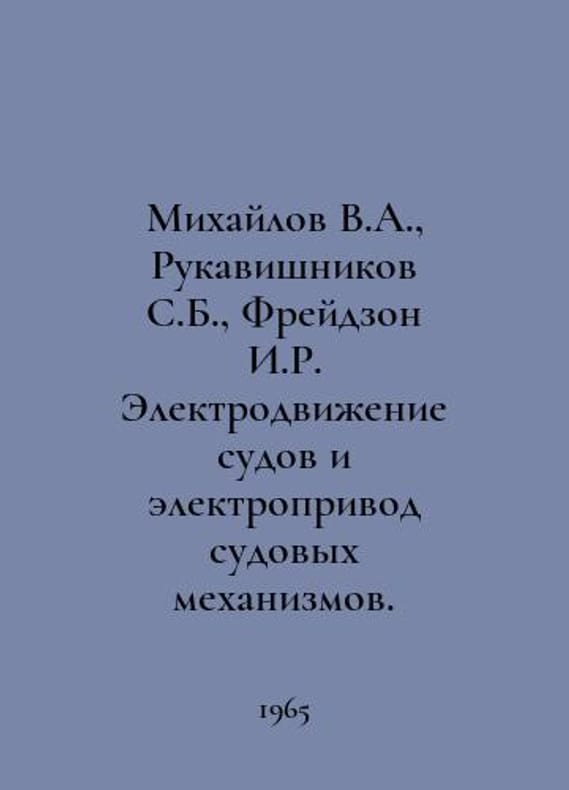 Mikhailov V.A., Rukavishnikov S.B., Freydzon I.R. Electric propulsion of vessels and electric drive of ships machinery. In Russian /Mikhaylov V.A., Rukavishnikov S.B., Freydzon I.R. Elektrodvizhenie sudov i elektroprivod sudovykh mekhanizmov. Leningrad. Shipbuilding in 1965.You are welcome to reach out to us for a detailed description of the copies currently available. SKUalb32cf4dbe4c98f8d0.