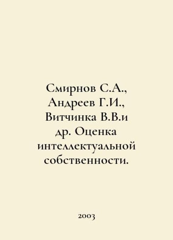 Smirnov S.A., Andreev G.I., Vitchinka V.V.et al. Assessment of Intellectual Property. In Russian /Smirnov S.A., Andreev G.I., Vitchinka V.V.i dr. Otsenka intellektualnoy sobstvennosti. M Finance and Statistics 2003.You are welcome to reach out to us for a detailed description of the copies currently available. SKUalb330da5bdfb6adf34.