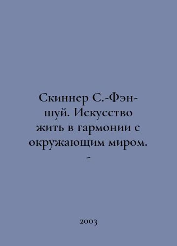 Skinner S.-Feng-shui. The Art of Living in Harmony with the World. In Russian /Skinner S.-Fen-shuy. Iskusstvo zhit v garmonii s okruzhayushchim mirom. - M.: Nyola 21st Century, 2003.You are welcome to reach out to us for a detailed description of the copies currently available. SKUalb3381721a1e51ac6c.