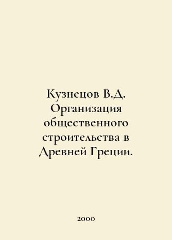 Kuznetsov V.D. Organization of Social Construction in Ancient Greece. In Russian /Kuznetsov V.D. Organizatsiya obshchestvennogo stroitelstva v Drevney Gretsii. M Languages of Slavic Cultures 2000. You are welcome to reach out to us for a detailed description of the copies currently available. SKUalb3418408eeee94c01.