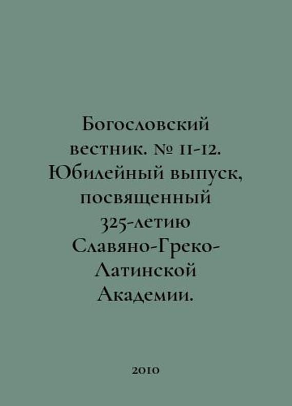 Theological Bulletin. # 11-12. Jubilee issue dedicated to the 325th anniversary of the Slavic-Greek-Latin Academy. In Russian /Bogoslovskiy vestnik. # 11-12. Yubileynyy vypusk, posvyashchennyy 325-letiyu Slavyano-Greko-Latinskoy Akademii. Posad Sergiev. STSL. 2010..You are welcome to reach out to us for a detailed description of the copies currently available. Delivery of this book may take longer than usual including extended processing and pre-shipping time, no expedited shipping is available. Please advise us if you have a set date or a deadline to receive your order. SKUalb38a8226597ad4cc4