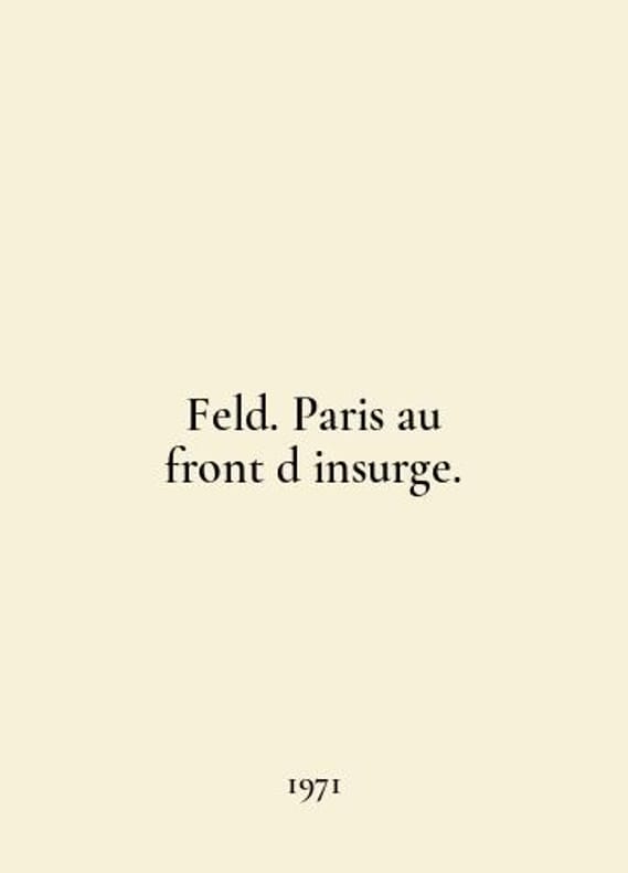 Feld. Paris au front d insurance. In French /Feld. Paris au front d insurge. In French, Paris 1971. You are welcome to reach out to us for a detailed description of the copies currently available. Delivery of this book may take longer than usual including extended processing and pre-shipping time, no expedited shipping is available. Please advise us if you have a set date or a deadline to receive your order.SKUalb38f0b528018db78b
