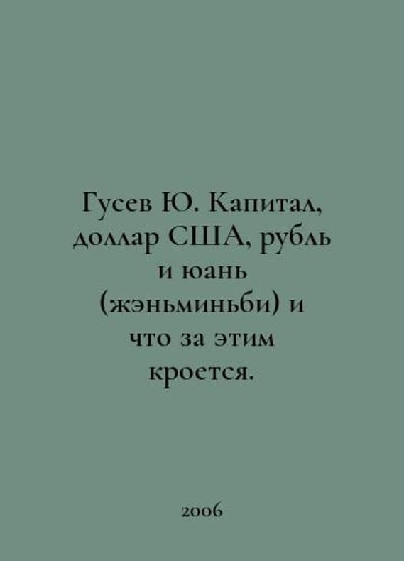 Yu Gusev Capital, the US dollar, the rouble and the renminbi (renminbi) and what lies behind it. In Russian /Gusev Yu. Kapital, dollar SShA, rubl i yuan (zhenminbi) i chto za etim kroetsya. M Self-education 2006.You are welcome to reach out to us for a detailed description of the copies currently available. SKUalb3920d326971aae66.