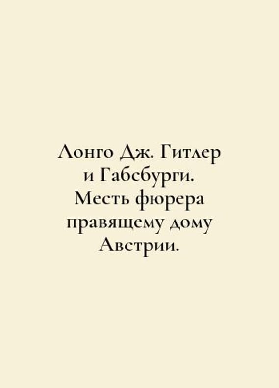 Longo J. Hitler and the Habsburgs. Fuhrers revenge on Austrias ruling house. In Russian /Longo Dzh. Gitler i Gabsburgi. Mest fyurera pravyashchemu domu Avstrii. M. KoLibri. 2021. 352s. You are welcome to reach out to us for a detailed description of the copies currently available. Delivery of this book may take longer than usual including extended processing and pre-shipping time, no expedited shipping is available. Please advise us if you have a set date or a deadline to receive your order.SKUalb397fd70c37c8a27d