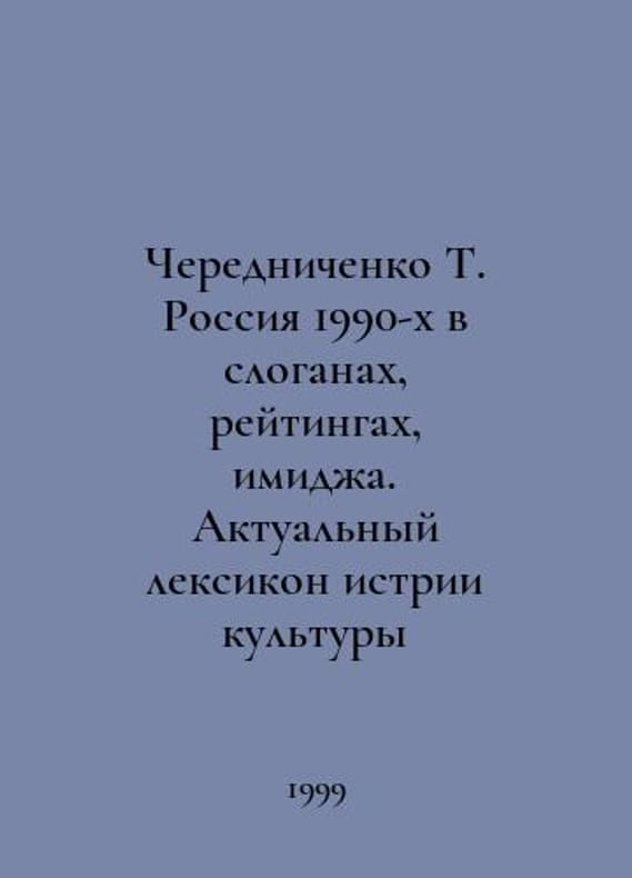 Cherednichenko T. Russia of the 1990 s in slogans, ratings, and image In Russian /Cherednichenko T. Rossiya 1990-kh v sloganakh, reytingakh, imidzha. Aktualnyy leksikon istrii kultury M. The New Literary Review 1999. You are welcome to reach out to us for a detailed description of the copies currently available. Delivery of this book may take longer than usual including extended processing and pre-shipping time, no expedited shipping is available. Please advise us if you have a set date or a deadline to receive your order.SKUalb2c606a62a5776ed1