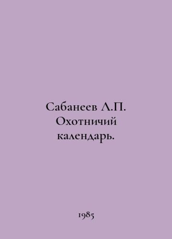 "Sabaneev L. Hunting Calendar. In Russian /Sabaneev L. Okhotnichiy kalendar. Reference Book for Gun and Dog Hunters,"" published in 1892. Series: Man and Nature, 1985.You are welcome to reach out to us for a detailed description of the copies currently available. Delivery of this book may take longer than usual including extended processing and pre-shipping time, no expedited shipping is available. Please advise us if you have a set date or a deadline to receive your order. SKUalb40a6457752255829"
