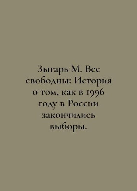 Zygar M. All are free: The story of how elections ended in Russia in 1996. In Russian /Zygar M. Vse svobodny: Istoriya o tom, kak v 1996 godu v Rossii zakonchilis vybory. M. Alpina Publisher 2020. You are welcome to reach out to us for a detailed description of the copies currently available. Delivery of this book may take longer than usual including extended processing and pre-shipping time, no expedited shipping is available. Please advise us if you have a set date or a deadline to receive your order.SKUalb5c79e95c6792c015